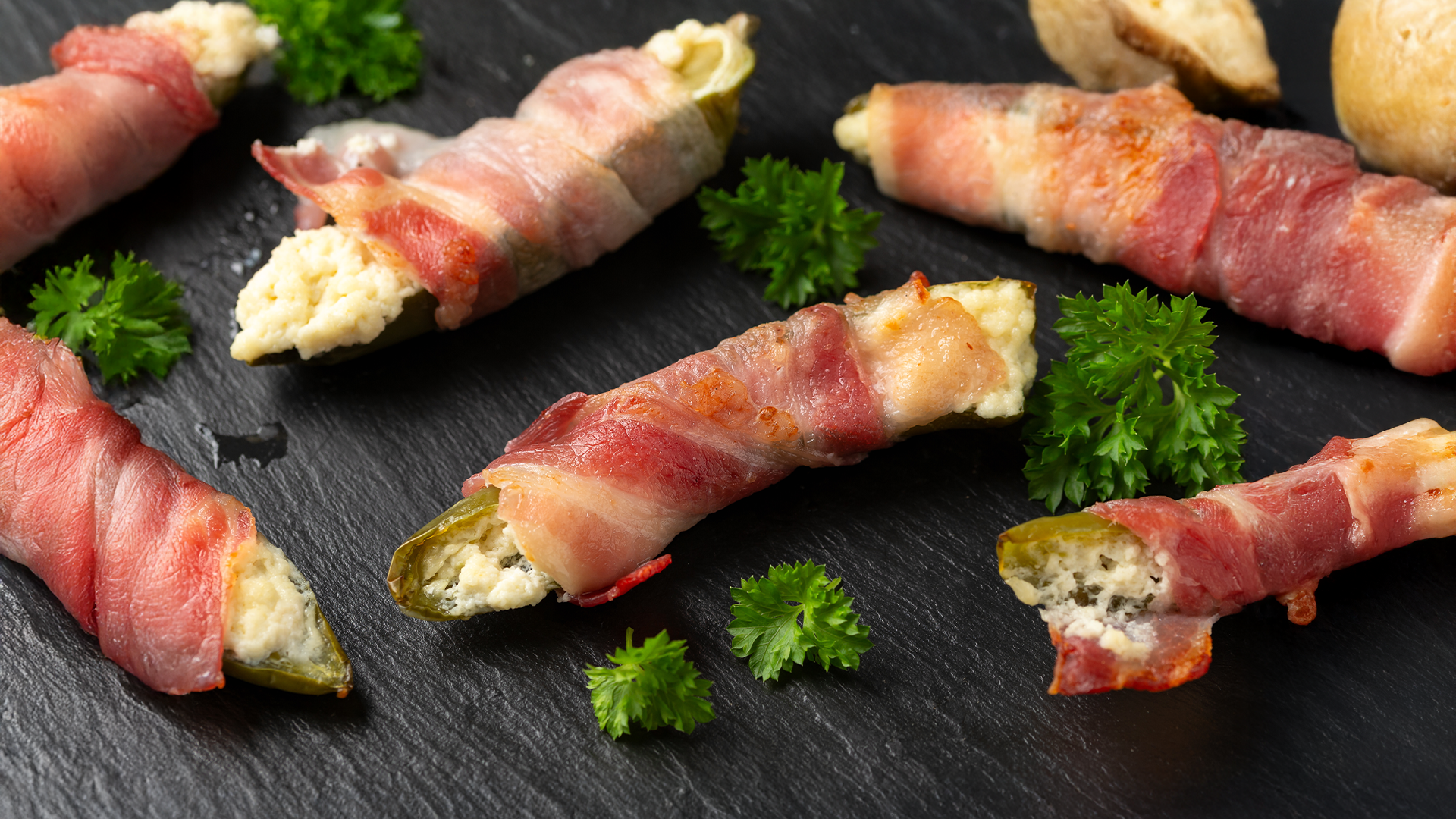 - Wrap each pepper with bacon and secure with toothpick.